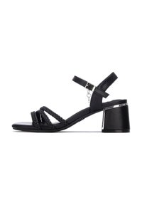 Sandalia dorada con tres tiras trenzadas en la parte delantera, correa de tobillo con hebilla y adorno, y tacón ancho.