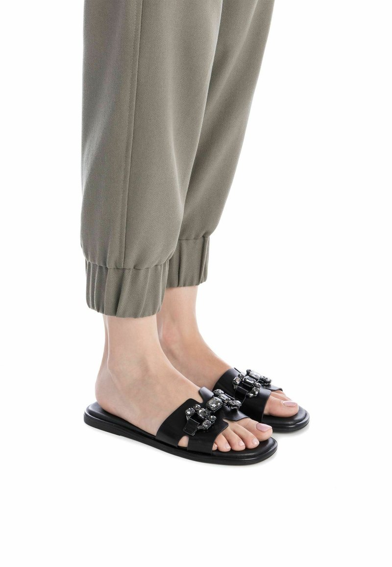 Chanclas negras con rhinestones decorativos, diseño de punta abierta y suela plana, combinadas con pantalones cortos de color verde oliva claro.