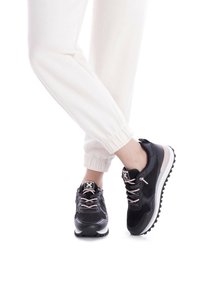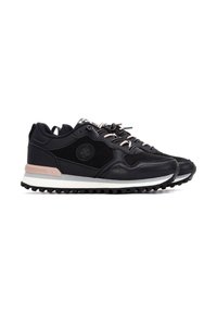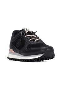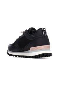 Zapatillas deportivas negras con acentos en rosa, materiales de ante texturizado y malla, con suela blanca contrastante y diseño de cordones.