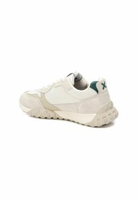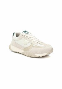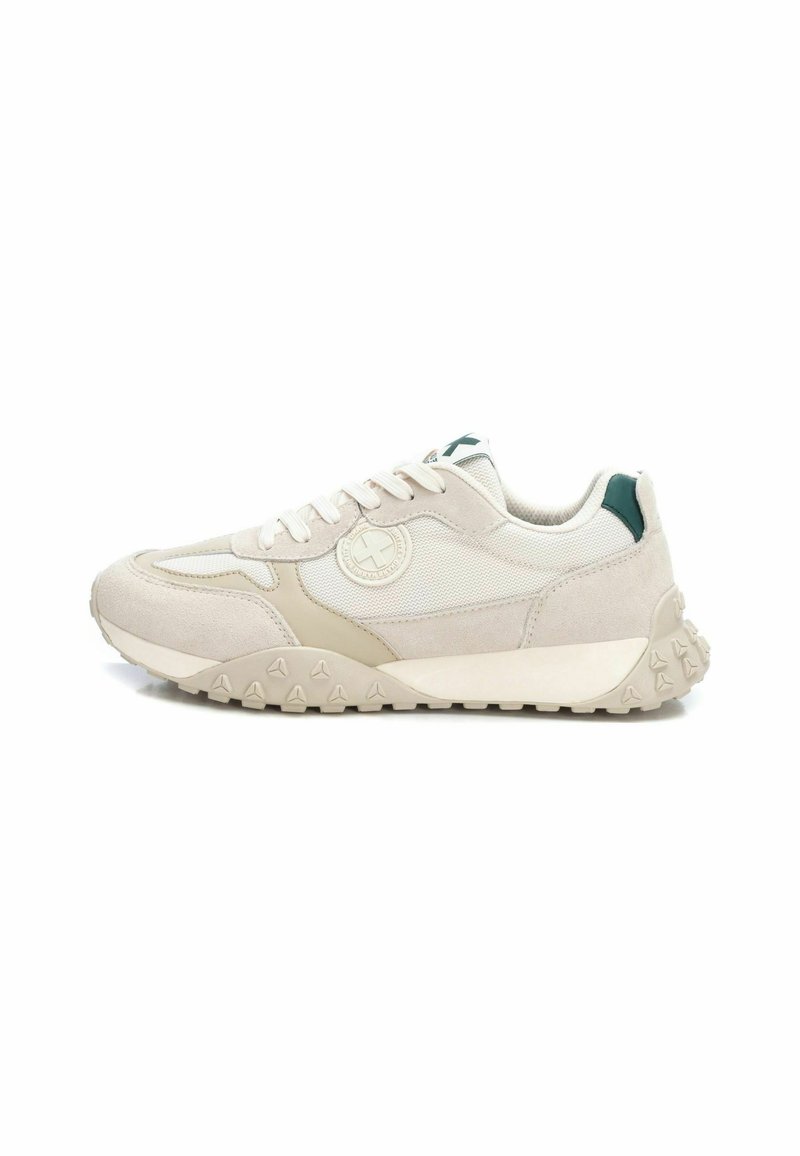 Zapatillas beige que cuentan con materiales de ante y malla, puntera redonda y suela de goma texturizada con relieve en forma de pirámide. Detalle verde en el talón.