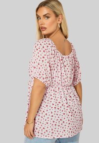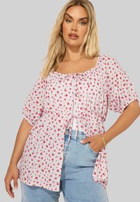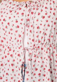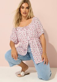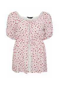 Mujer rubia con una blusa blanca con pequeño estampado floral rojo, mangas cortas y un lazo delantero, combinada con jeans azul claro y pulseras doradas.