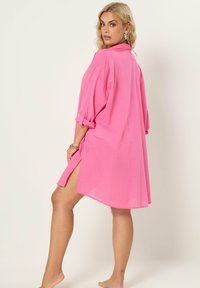 Mujer rubia con un traje de baño blanco con detalles dorados y una camisa abierta de color rosa brillante con botones, posando frente a un fondo liso.