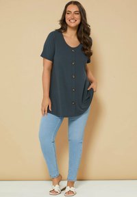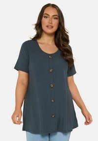 Mujer con cabello largo y ondulado que lleva una túnica de manga corta acanalada de color azul oscuro con cinco botones marrones en la parte delantera, combinada con jeans azul claro.