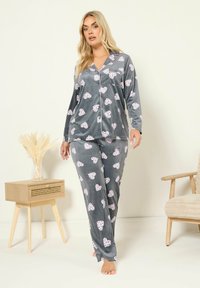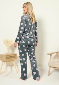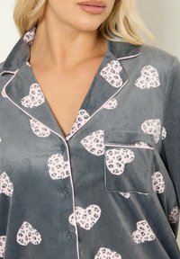 Conjunto de pijama de terciopelo gris con patrones de corazones blancos. La parte superior tiene un diseño de botones con un bolsillo en el pecho, y los pantalones son de corte holgado.