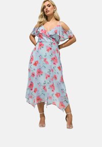Mujer con vestido midi azul claro con hombros descubiertos, estampado floral rosa, escote con volantes y sandalias plateadas de tacón alto, posando con las manos en las caderas.