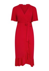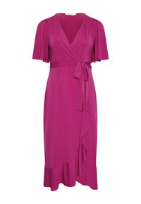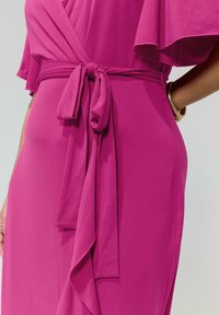 Mujer rubia con un vestido cruzado de color rosa brillante con mangas acampanadas y dobladillo con volantes, de pie con la mano en la cadera, sandalias doradas de tacón.