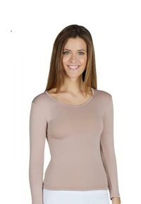 Top de manga larga en un color marrón suave, hecho de una tela blanda con escote redondo y una forma ajustada. Se lleva con ropa interior blanca.