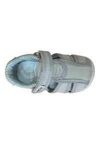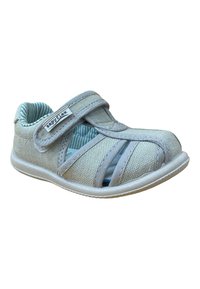 Sandalia para niño pequeño de color gris claro con puntera cerrada, correa ajustable de Velcro etiquetada "Zapyflex" y forro interior acolchado con rayas.