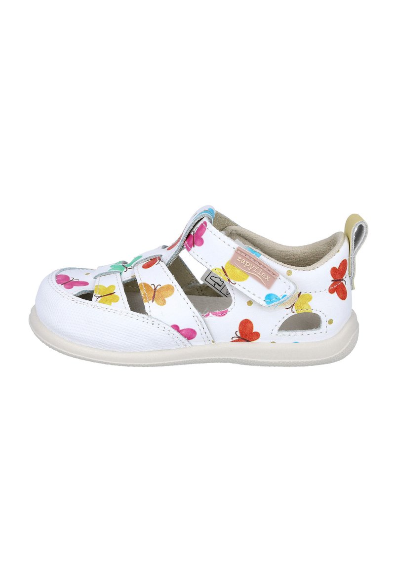 Sandalia blanca para niños con estampados coloridos de mariposas, correa de velcro con la etiqueta "zapyflex" y diseño transpirable con recortes.