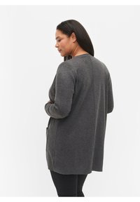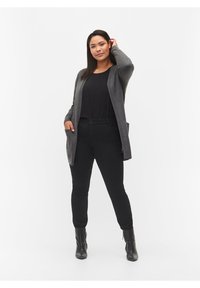 Mujer con un cárdigan gris oscuro abierto sobre una blusa negra y pantalones negros, de pie con una mano en el bolsillo.